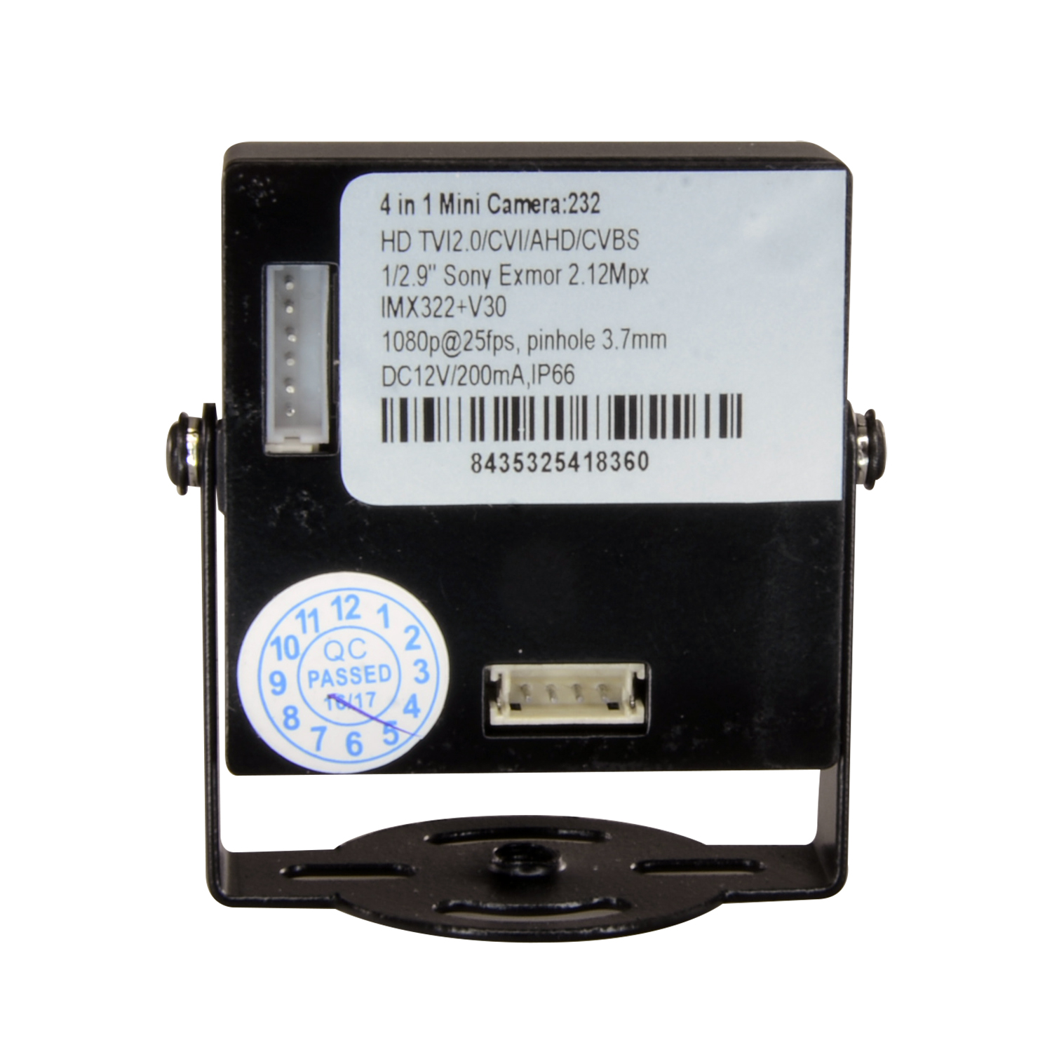Bestehend aus einem 1/2,9" Sony© 2,12 Megapixel Exmor Sensor (Modell IMX322) und DSP (Modell V30), der eine Auflösung von 1080p bei 25 FPS bietet. 3,7 mm festes Pinhole-Objektiv mit einer Diagonale Sichtfeld von 79º, Mindestbeleuchtung von 0,1 Lux.