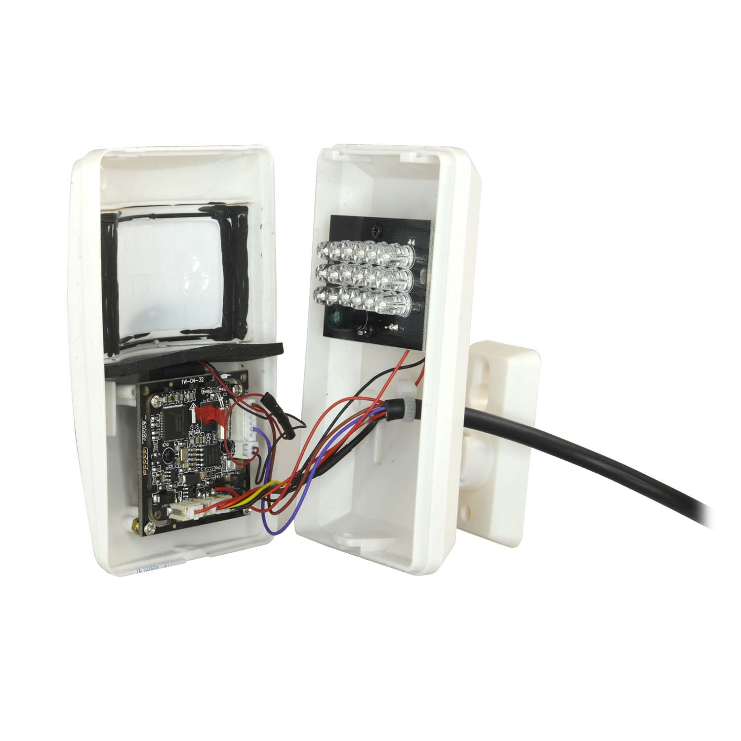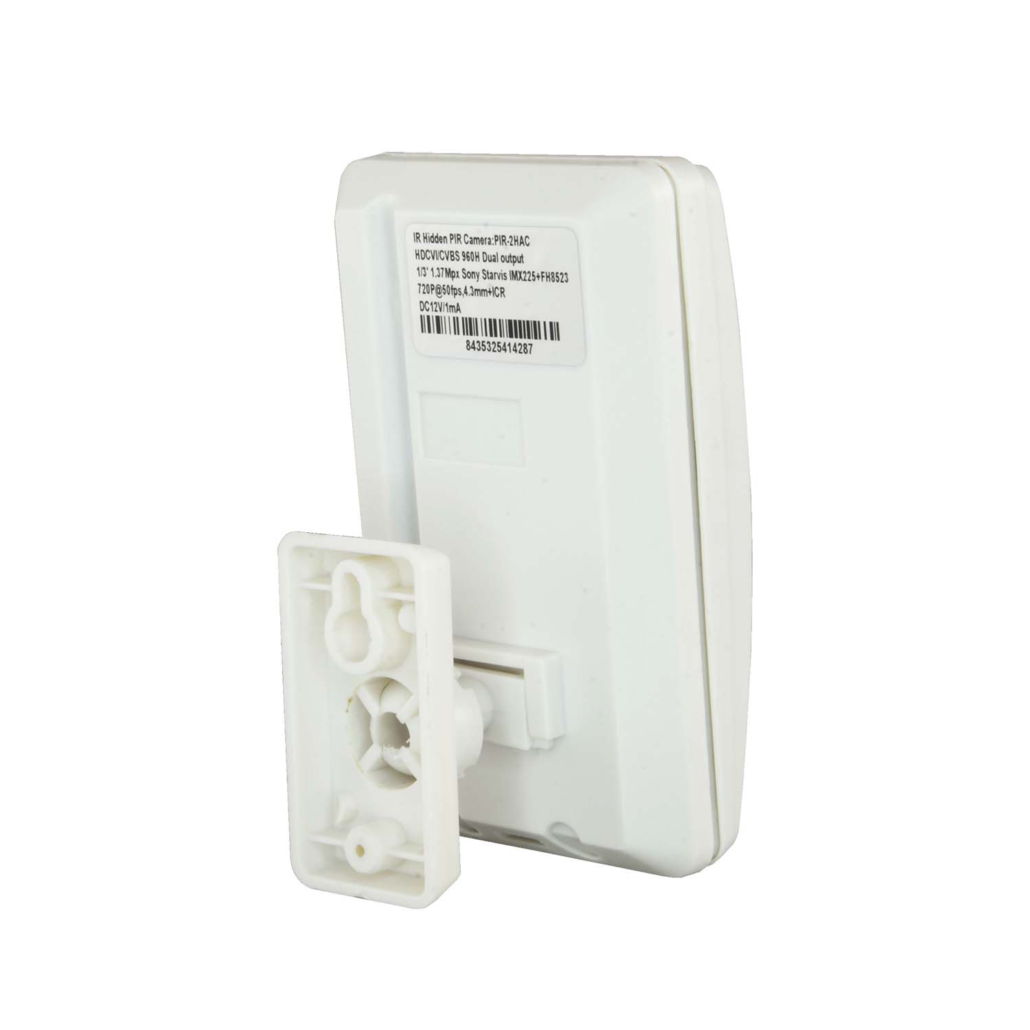 Bestehend aus einem 1/2,9" Sony© 2,12 Megapixel Exmor Sensor (Modell IMX322) und DSP (Modell V30), der eine Auflösung von 1080p bei 25 FPS bietet. 3,7 mm festes Pinhole-Objektiv mit einer Diagonale Sichtfeld von 79º. 18 Infrarot-LEDs, die automatisch aktiviert werden und ein scharfes Bild bei 0 Lux (völlige Dunkelheit) in einer maximalen Entfernung von 10 m liefern. Die IR-LEDs befinden sich hinter der simulierten PIR-Linse. Wenn aktiviert, simulieren sie die Beleuchtung eines echten PIR Detektor Er verfügt über einen automatischen IR-Cut-Filter, der klare, echte Farbaufnahmen bei Tag ermöglicht.