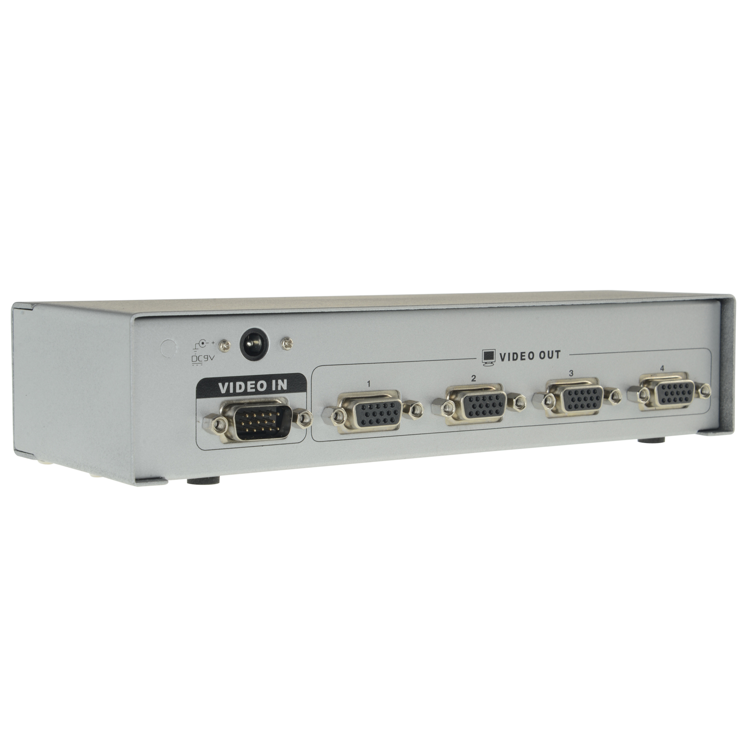 Aktives Gerät, das das Videosignal von einer VGA-Quelle (Computer, DVR usw.) auf 4 Ausgänge dupliziert. Bieten Sie dadurch schnelle und flexible Lösungen für Situationen wie die Übertragung von Videoinformationen an die Öffentlichkeit, die Überwachung in Arbeitsumgebungen oder den Einsatz in Unternehmens- oder Bildungseinrichtungen.